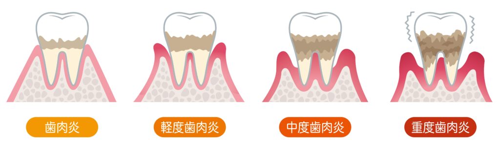 歯周病は進行性の病気で、「歯肉炎」という歯茎の炎症から始まり、悪化すると「歯周炎」という状態に移行していきます。