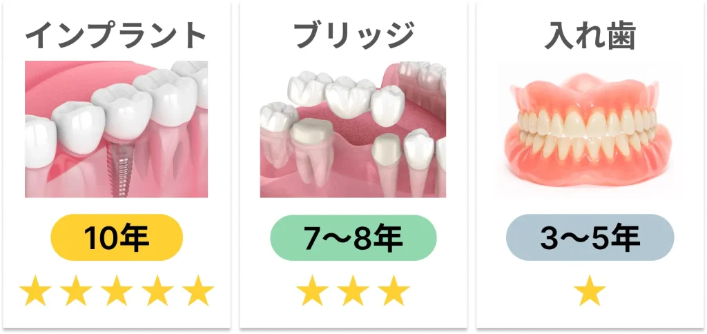 インプラントは入れ歯やブリッジに比べて頑丈で長持ちする と言えますので実は機能面、審美面、耐久性、コストパフォーマンスのよい治療方法といえるかもしれません。