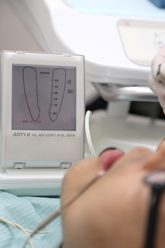 ファイルと呼ばれる器具で神経管の掃除をします。また、次亜塩素酸ナトリウム、EDTAといった洗浄液を用いて消毒していきます。根の中は肉眼で確認することができませんから、特殊な測定器を用いて根の長さや状態を計測していきます。