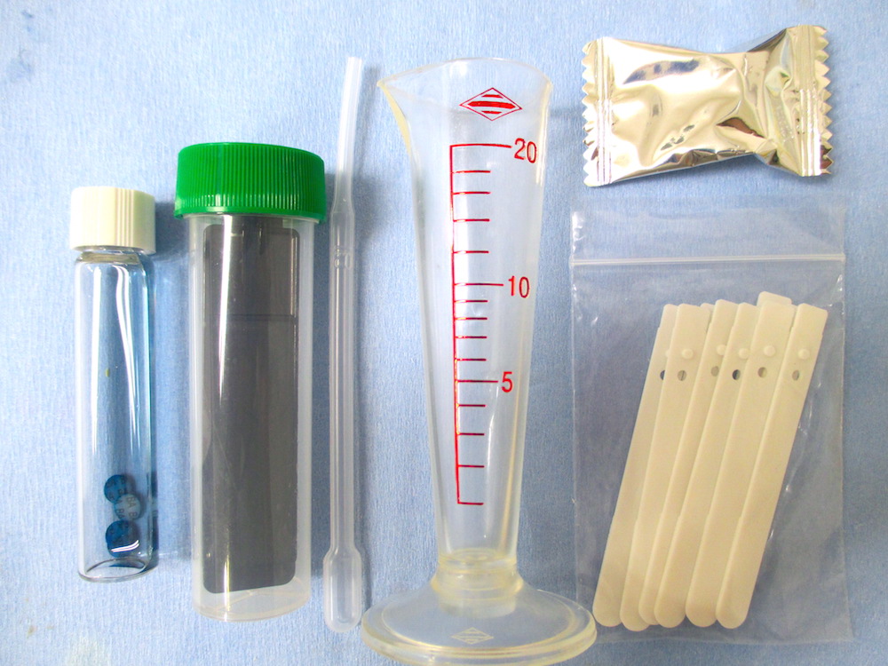 イスにリラックスした状態で味のないガムを5分間噛んで静かに唾液をためメスシリンダーに採取します。