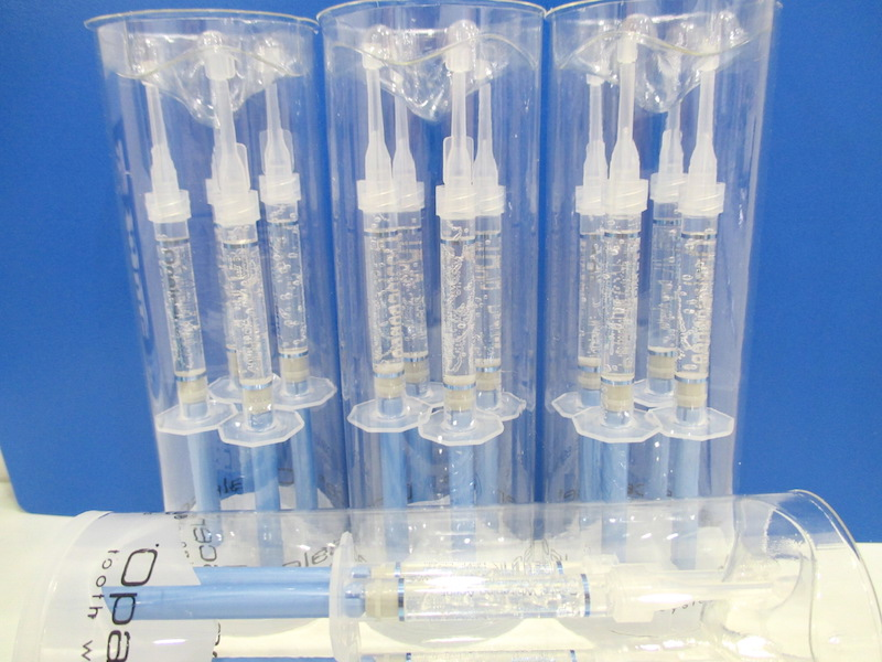 ホワイトニングトレーに薬剤を少量(歯の先端1/3程度)入れ装着します。 ※薬剤があふれたらティッシュなどでふき取りましょう。 - 装着